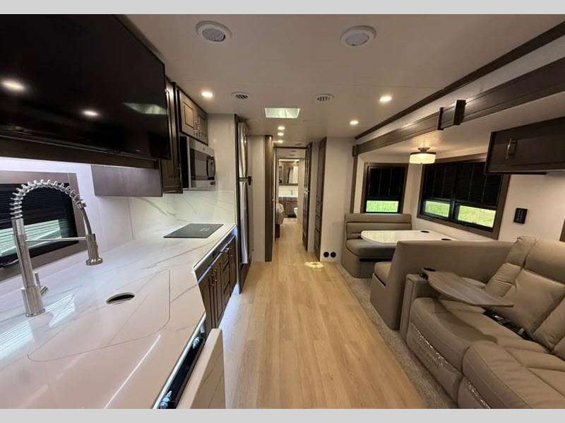 Sleeps 5 Slides 2 Length 36 ft 8 in Ext Width 8 ft 5 in Ext Height 12 ft 9 in Interior Color Saddle, Milano II Exterior Color Admiral Blue, Magnetic Full Body Paint Choices or Opt. Xplorer in Light or Dark Full Body Paint Hitch Weight 20000 lbs GVWR 33000 lbs Fresh Water Capacity 94 gals Grey Water Capacity 52 gals Black Water Capacity 52 gals Tire Size 22.5" Generator 8kW Onan Diesel Fuel Type Diesel Engine Cummins L9 Chassis Freightliner M2 106 Plus Horsepower 360 hp Fuel Capacity 100 gals Wheelbase 268 in Available Beds King Torque 1150 ft-lb Refrigerator Type Residential with Ice Maker Refrigerator Size 18 cu ft Convection Cooking Yes Cooktop Burners 3 Number of Awnings 1 Axle Weight Front 12000 lbs Axle Weight Rear 21000 lbs LP Tank Capacity 20.3 gals Water Heater Type Aqua Hot 400D Diesel AC BTU 30000 btu TV Info LR LED Smart TV, BR 32" LED Smart TV, Ext. LED Smart TV Awning Info 18' Armless with LED Lights and Wind Sensor Washer/Dryer Available Yes Gross Combined Weight 54000 lbs Shower Type Standard Electrical Service 50 amp Similar Floorplans