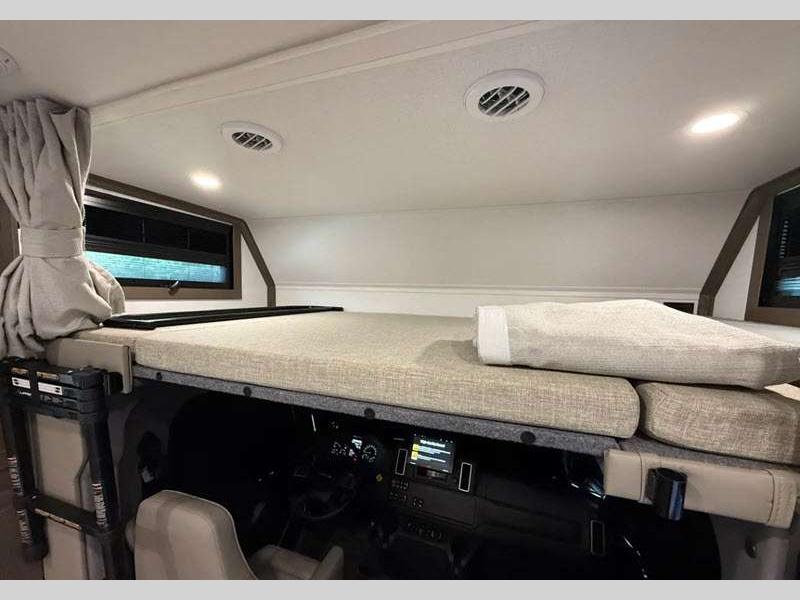 - Extended Fiberglass Front Cap with Cab-Over Bunk Mattress and Privacy Curtain