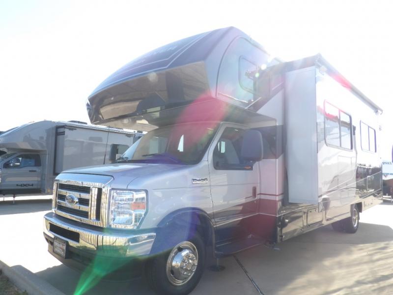 Sleeps 7 Slides 2 Length 32 ft 3 in Ext Width 8 ft 5 in Ext Height 11 ft 3 in Exterior Color Standard Graphics. Full-Body Paint; Pacific, Garnet GVWR 14500 lbs Fresh Water Capacity 44 gals Grey Water Capacity 39 gals Black Water Capacity 39 gals Furnace BTU 30000 btu Generator 4.0 kW Gas Fuel Type Gasoline Chassis Ford Fuel Capacity 55 gals Wheelbase 220 in Number Of Bunks 1 Available Beds RV Queen Refrigerator Type 12V Refrigerator Size 10.7 cu ft Convection Cooking Yes Cooktop Burners 3 Shower Size 24" x 36" Number of Awnings 1 Axle Weight Front 5000 lbs Axle Weight Rear 9600 lbs LP Tank Capacity 41 lbs Water Heater Capacity 6 gal Water Heater Type DSI Gas/Electric AC BTU 15000 btu TV Info LR 12V LED TV, BR 12V TV Awning Info 15' 6" Power w/LED Light Strip Gross Combined Weight 22000 lbs Shower Type Standard Electrical Service 30 amp Similar Motor Home Class C Floorplans