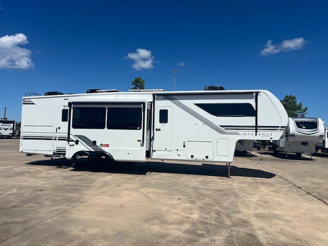 Any Grand Design Influence fifth wheel features five-sided aluminum cage construction with a walk-on roof and a fully enclosed underbelly with heated tanks and storage for all weather camping. For peace of mind, the MORryde CRE3000 Suspension system will provide safe and smooth towing, and the 101" widebody construction offers all the room you need and that is before multiple slides are fully engaged. You will appreciate the Keyed-Alike locks, slam-latch baggage doors with magnetic door catches, exterior security light, and SolidStep entry steps. On the inside, Congoleum flooring, premium roller shades for privacy, a hallway handrail for safety, and nightstands with USB ports to keep all of your electronics fully charged. You will also love the On Demand tankless water heater when showering, plus the added heat and ambiance from an electric fireplace, and so much more!