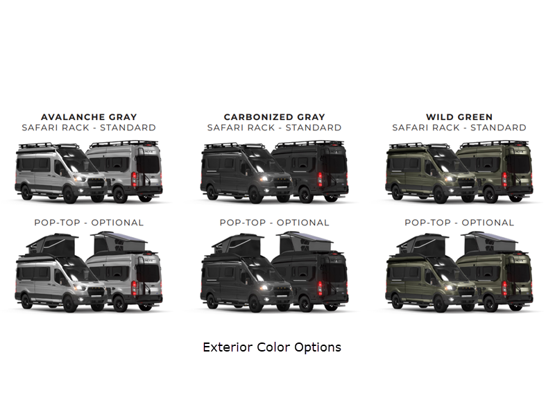 Sleeps 2 Length 20 ft 11 in Ext Width 6 ft 9 in Ext Height 10 ft 2 in Int Height 6 ft 4 in Exterior Color Carbonized Gray, Avalanche Gray, Wild Green GVWR 9950 lbs Fresh Water Capacity 34 gals Grey Water Capacity 23 gals Tire Size 255/70R16 120/117S Furnace BTU 6800 btu Fuel Type Gas Engine 3.5L V6 GTDi Chassis Ford W2XC T350 AWD Horsepower 310 hp Fuel Capacity 25 gals Wheelbase 148 in Available Beds Murphy Torque 400 ft-lb Refrigerator Type 12V Drawer Style Refrigerator Size 3.2 cu ft Number of Awnings 1 Axle Weight Front 4630 lbs Axle Weight Rear 6100 lbs Water Heater Capacity 2.5 gal AC BTU 20000 btu TV Info Projector and Screen Awning Info 11'6" Girard w/Wind Sensor Gross Combined Weight 12600 lbs Shower Type Wet/Bath Shower Electrical Service 30 amp Solar Wattage 360 watts Similar Floorplans