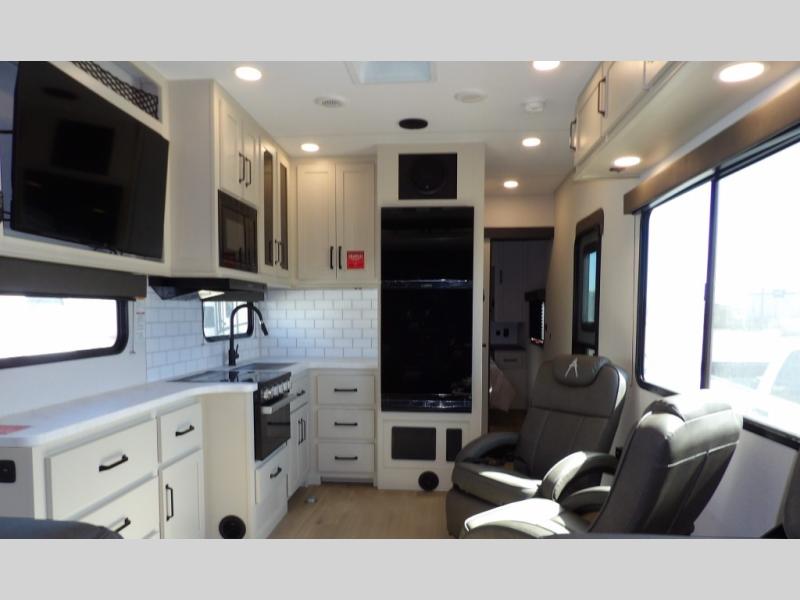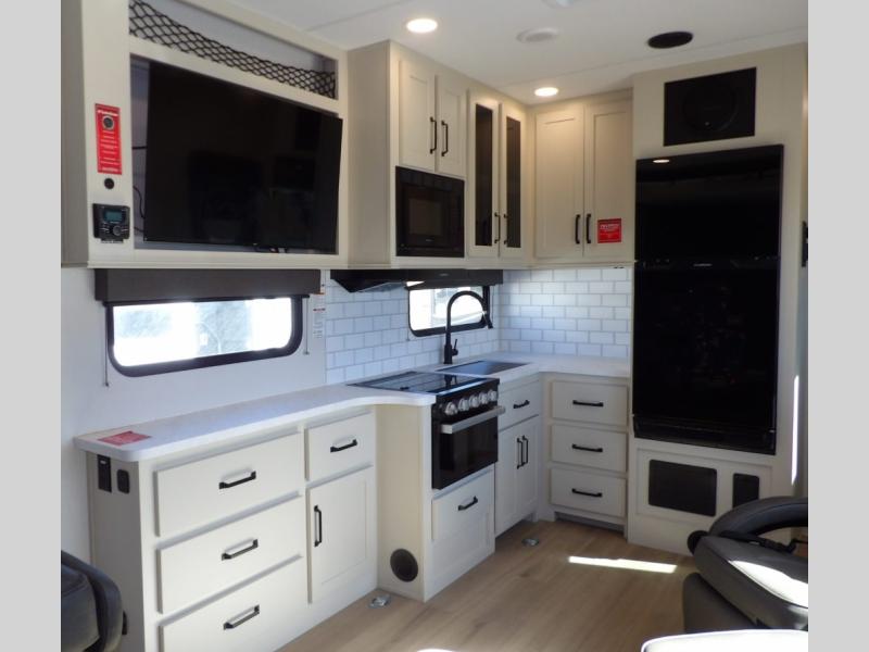 Each model also includes a universal docking center, a fiberglass front cap with paint and LED lighting, a heated and enclosed underbelly for four seasons of traveling, and a dovetail rear end. The Momentum G-Class also comes with large panoramic windows, residential cabinetry, motion-sensor lighting, and stainless steel-accented appliances. The fun will not stop when listening to the exterior speakers, and the awning with LED lighting will create an outdoor living space you are sure to love.Β