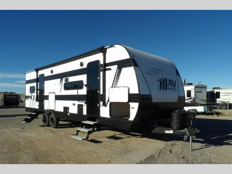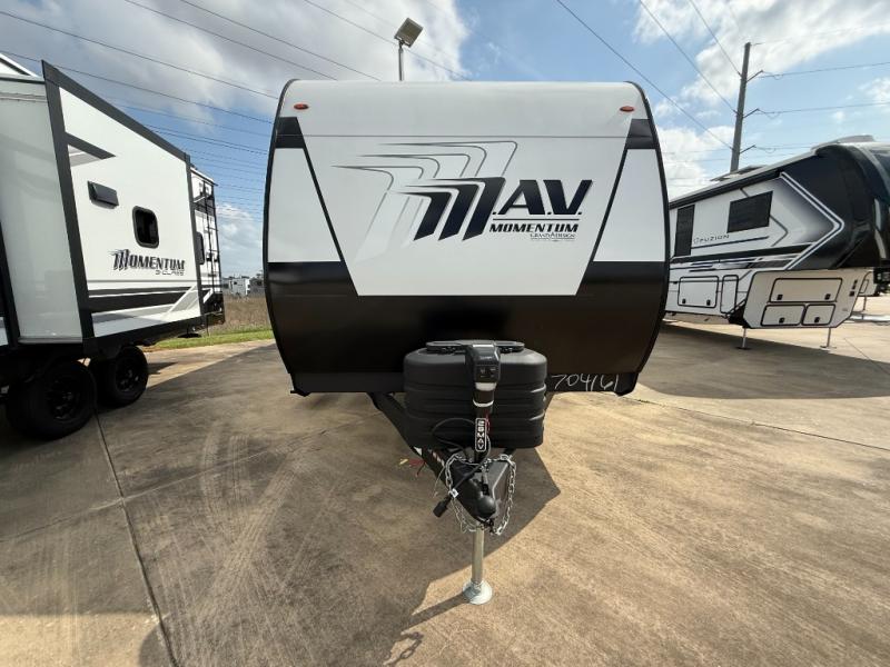 MAV stands for Momentum Adventure Vehicle, and you will surely have grand adventures in this one. The Strong Wall aluminum construction is 25% thicker than the competition and the double insulated roof is ultra durable. Thoughtful design touches make life easier, like the magnetic storage door catches and the lack of wheel wells in the garage, which gives you full use of the cargo area. Inside you'll find solid hardwood drawer fronts, residential countertops, and a solid bedroom door. The Solar Package provides off-grid capabilities with a 180W solar panel, 12V refrigerator, battery monitor, and 40 Amp charge controller with Bluetooth!