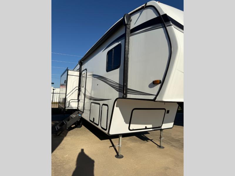 Sleeps 5 Slides 2 Length 31 ft Ext Width 8 ft Ext Height 12 ft 3 in Hitch Weight 1348 lbs GVWR 10995 lbs Dry Weight 8400 lbs Fresh Water Capacity 55 gals Grey Water Capacity 78 gals Black Water Capacity 39 gals Tire Size ST225/75R15 LRE Furnace BTU 30000 btu Available Beds Queen Refrigerator Type 12V Refrigerator Size 10 cu ft Cooktop Burners 3 Shower Size 30" x 36" Number of Awnings 1 LP Tank Capacity 30 lbs Water Heater Type On Demand Tankless AC BTU 15000 btu TV Info LR 40" High-Definition LED TV Awning Info 13' One Touch Electric LED Axle Count 2 Number of LP Tanks 2 Shower Type Walk-In Shower Electrical Service 50 amp Similar Fifth Wheel Floorplans