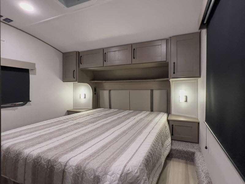 Each fifth wheel has 90-degre turning radius capabilities which allows you to be comfortable driving in town and parking into your campsite. Some construction and Arctic 4-Seasons Protection package features include a one-piece TPO roof membrane, a heated and enclosed underbelly with circulating heat, 12V heat pads on the holding tanks, and a heated pass-through storage area so you can travel and enjoy any climate. The interior offers large panoramic slide room windows for great views, premium Congoleum flooring for durability, and an On Demand water heater.