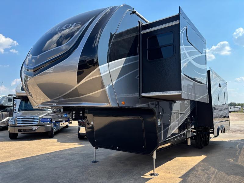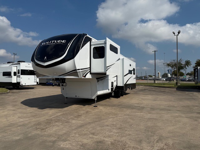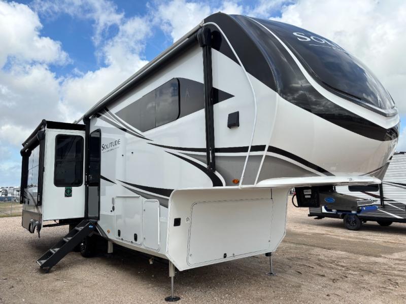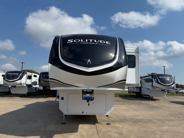Each Solitude fifth wheel by Grand Design features a 101" wide-body construction, heavy duty 8,000 lb. axles, frameless tinted windows, and high-gloss gel coat sidewalls. You can camp year around thanks to the Weather-Tek Package that includes a 35K BTU high-capacity furnace, an all-in-one enclosed and heated utility center, and a fully enclosed underbelly with heated tanks and storage. Inside, you'll love the premium roller shades, hardwood cabinet doors, solid surface countertops, plus residential finishes throughout to make you truly feel at home. Each model also includes a MORryde CRE3000 suspension system, self adjusting brakes, and a MORryde pin box that will provide smooth towing from home to campground. Affordable luxury is possible with the Solitude fifth wheels; choose yours today!