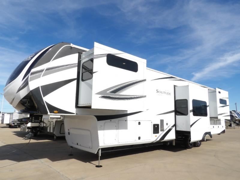 Each Solitude fifth wheel by Grand Design features a 101" wide-body construction, heavy duty 8,000 lb. axles, frameless tinted windows, and high-gloss gel coat sidewalls. You can camp year around thanks to the Weather-Tek Package that includes a 35K BTU high-capacity furnace, an all-in-one enclosed and heated utility center, and a fully enclosed underbelly with heated tanks and storage. Inside, you'll love the premium roller shades, hardwood cabinet doors, solid surface countertops, plus residential finishes throughout to make you truly feel at home. Each model also includes a MORryde CRE3000 suspension system, self adjusting brakes, and a MORryde pin box that will provide smooth towing from home to campground. Affordable luxury is possible with the Solitude fifth wheels; choose yours today!