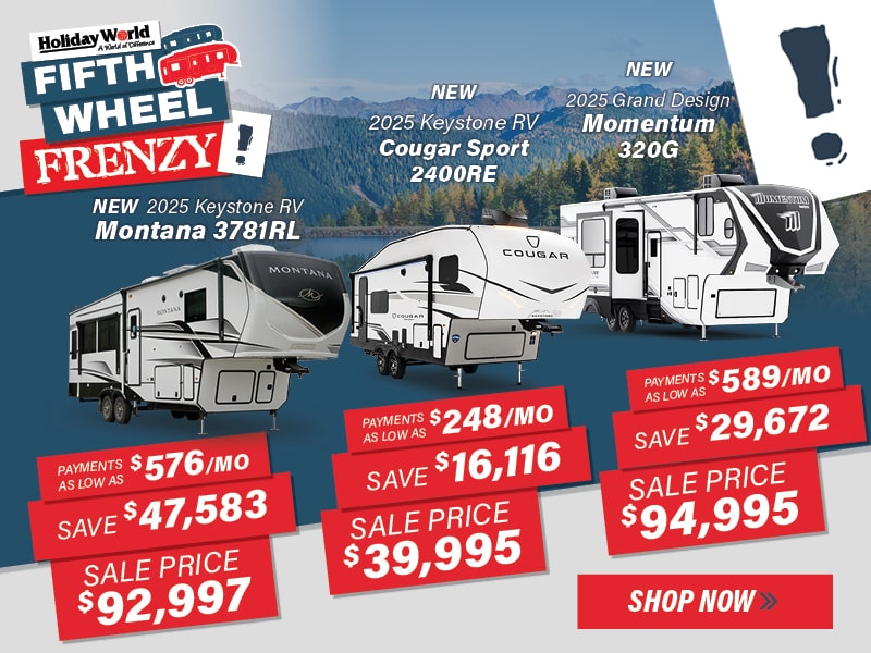 This lightweight fifth wheel is big enough for your small family to camp together! Enter to find a convenient combined kitchen and living space with large slide for added space. The slide features theater seating and a booth dinette which offers ample seating for meals and hanging out. There is a flip up table along the rear wall with a nearby 40" LED TV which features a butler pantry behind. Head up the steps to the right of the entry door to a complete bath and private front bedroom featuring a queen size bed with dual nightstands on both sides of the bed. The bathroom offers a shower with a skylight for added headroom and natural lighting. Outside, a 16' awning provides added living space protected from the elements! The Cougar Sport structural I-beam frame with stamped steel cross-members and outriggers, plus its AlphaPly roof membrane are what active RVers love about the construction of the Cougar line. The Cougar Sport models are no exception when it comes to a great package, as well as being smaller and lighter weight than their big brother Cougar models. A one-piece, heated and enclosed polypropylene underbelly will add protection against the elements, and the electric stabilizer jacks will provide more stability. On the inside, residential shaker style hardwood cabinet doors and decorative crown molding, plus seamless pressed countertops and an on-demand water heater will make your unit feel even more like home. You are also sure to appreciate the shiplap style decorative accent wall behind the bed, a porcelain foot flush toilet in the bathroom, plus residential kitchen hardware, and so much more. We have 4 2400RE availableView InventorySpecificationsSleeps 3 Slides 1 Length 28 ft 11 in Ext Height 12 ft 7 in Hitch Weight 1345 lbs Dry Weight 7474 lbs Cargo Capacity 2026 lbs Fresh Water Capacity 54 gals Grey Water Capacity 60 gals Black Water Capacity 30 gals Tire Size ST225/75R15E Available Beds Queen Refrigerator Type 12 Volt Refrigerator Size 10.4 cu ft Cooktop Burners 3 Number of Awnings 1 LP Tank Capacity 30 lbs. Water Heater Type Girard Tankless On Demand AC BTU 15000 btu TV Info LR 40" LED TV Awning Info 16' Electric w/Gas Strut Arm and Dotless Neon Style LED Lighting Axle Count 2 Number of LP Tanks 2 Shower Type Standard Electrical Service 50 amp Similar Fifth Wheel Floorplans