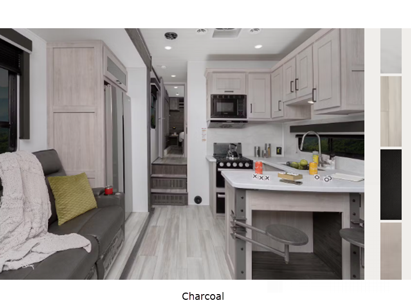 Sleeps 6 Slides 1 Length 33 ft 5 in Ext Width 8 ft 4 in Ext Height 12 ft 5 in Interior Color Charcoal, Stone Hitch Weight 1175 lbs Dry Weight 7602 lbs Cargo Capacity 3698 lbs Fresh Water Capacity 54 gals Grey Water Capacity 30 gals Black Water Capacity 30 gals Tire Size ST225/75R15E Furnace BTU 35000 btu Fuel Capacity 30 gals Number Of Bunks 1 Available Beds RV Queen Refrigerator Type 12V Refrigerator Size 10 cu ft Cooktop Burners 3 Number of Awnings 1 Axle Weight 5100 lbs Garage Size 15 ft LP Tank Capacity 30 lbs Water Heater Type Girard On Demand Awning Info 18' Electric with Adjustable Arms, Auto Dump, LED Lights Axle Count 2 Number of LP Tanks 2 Shower Type Tub/Shower Combo Electrical Service 50 amp Similar Floorplans