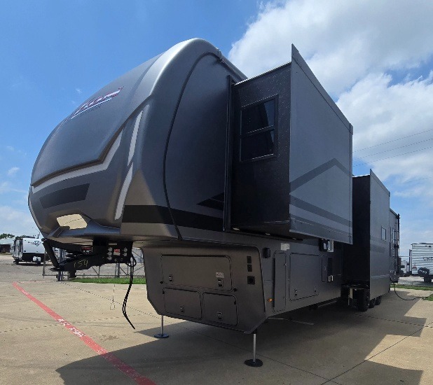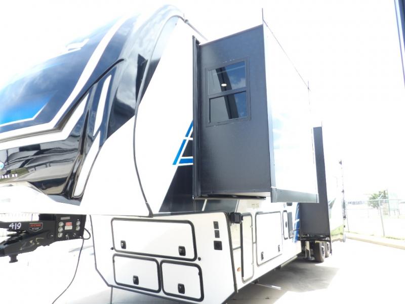 Sleeps 9 Slides 3 Length 44 ft 6 in Ext Height 13 ft 3 in Hitch Weight 3770 lbs Dry Weight 16935 lbs Cargo Capacity 4065 lbs Fresh Water Capacity 173 gals Grey Water Capacity 104 gals Black Water Capacity 104 gals Furnace BTU 35000 btu Generator 5500 Flex Power Fuel Capacity 60 gals Number Of Bunks 1 Available Beds King Refrigerator Type Stainless Steel Residential Convection Cooking Yes Cooktop Burners 4 Number of Awnings 2 Axle Weight 8000 lbs Garage Size 16 ft LP Tank Capacity 30 lbs Water Heater Type Girard On Demand TV Info LR TV, BR Smart TV, Garage LED TV, Ext. 50" TV Awning Info 8', 13', 14' Girard Cassette w/LED Lighting Axle Count 3 Washer/Dryer Available Yes Number of LP Tanks 2 Shower Type Shower w/Seat Electrical Service 50 amp Similar Toy Hauler Fifth Wheel Floorplans