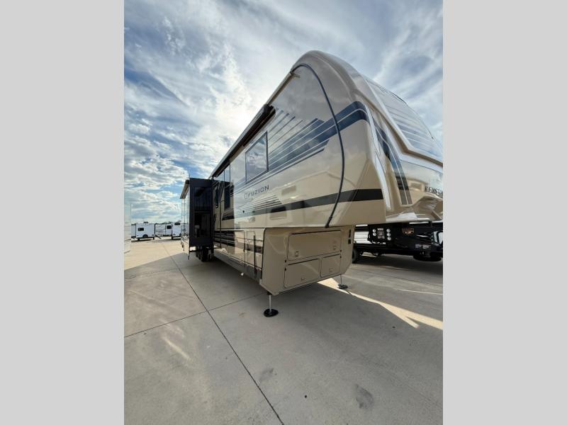 Get your adrenaline pumping with any one of these Keystone RV Fuzion fifth wheel toy haulers! The frame welded, Adjust-A-Trac tie-downs have 38 points to fully secure your toys as you travel, and the extended garage lengths have outside storage so you can haul bigger toys. A fuel pump station will let you easily fill up before heading out, and the exclusive Omni-Chill technology offers high-efficiency air conditioning and maximum cooling. The interior provides fiberglass backed linoleum flooring, extra-tall slide height, solid wood cabinet and drawer frames, and extra tall ceilings with crown molding to mention a few luxuries. Outside, you'll find three Girard cassette awnings, 4k framed tinted safety glass windows, a Titan hydraulic leveling system, and many more conveniences!