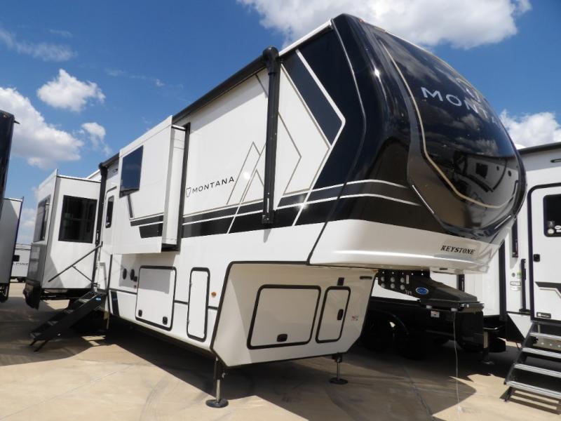 Enjoy luxury, innovation, and the outdoors in any one of Montana's finest fifth wheels. Each set the standard with exceptional features, and exciting factory installed options to provide you a great home on the road. Keystone's 12" I-beam chassis with z-frame technology provides a strong and durable foundation to your fifth wheel, and the four season living package will help extend your camping season. A few other construction features you will appreciate include a MORryde CRE3000 suspension, a fully walkable roof with an alpha seamless TPO membrane system, and 4k square frameless tinted safety glass windows. Each feature stylish interiors with two decor choices paired with beautiful hardwood cabinetry, Beauflor vinyl flooring throughout, central vacuum, plus a La-Z-Boy furniture package for all-around comfort!