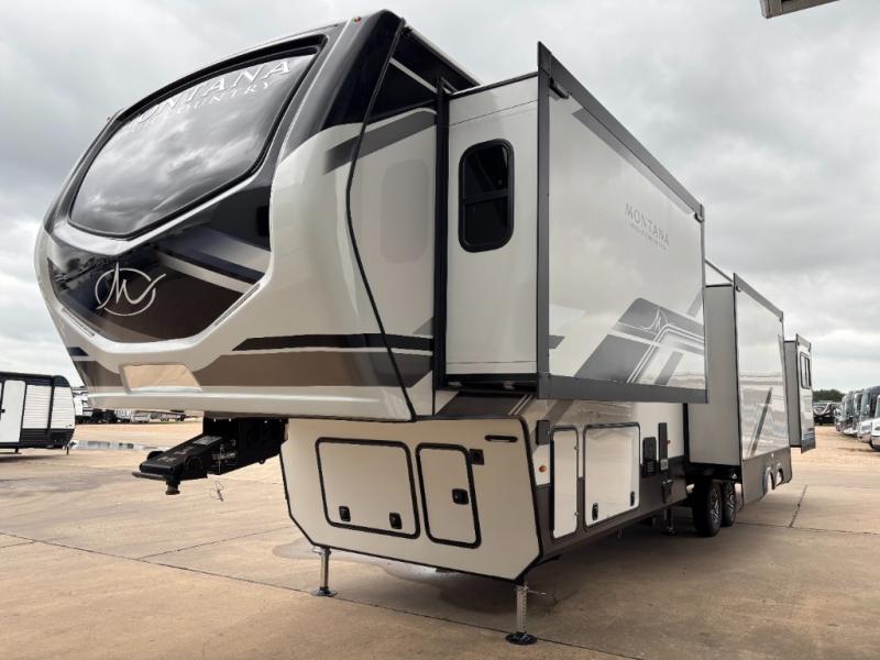 With any Montana High Country fifth wheel by Keystone, you'll find comfort and convenience at every turn! Each unit is built with a fully walkable roof with an Alpha seamless TPO membrane system, 2" thick composite backed high-gloss fiberglass sidewalls, plus an insulated underbelly with forced hot air and electric tank heaters for added protection against the elements. The Blade Pure airflow system provides efficient cooling, and the Tru-Fit slide construction is a durable slide design that minimizes functional motor structural stress and resists leaking. Inside, you'll find roller shades throughout, premium solid surface kitchen countertops, bedside USB and 110V outlets, plus a porcelain foot flush toilet in the bath to name a few comforts.