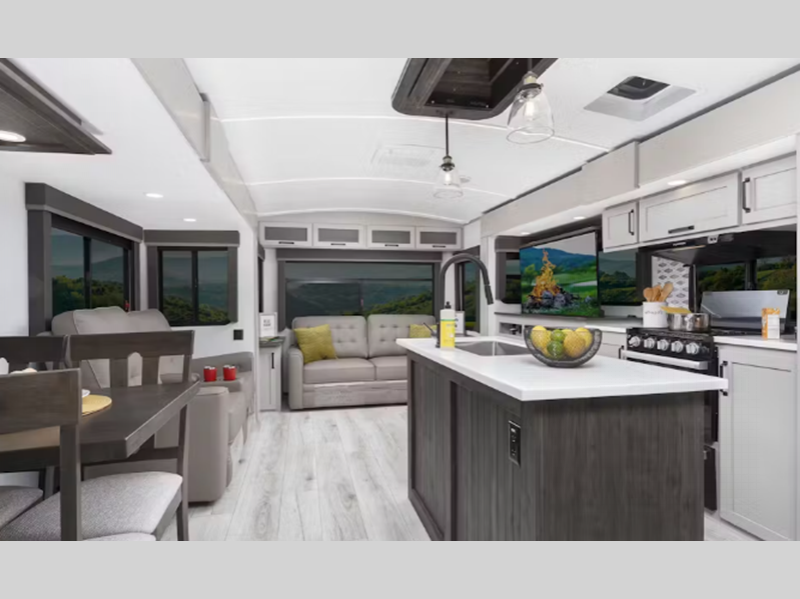 Sleeps 5 Slides 3 Length 37 ft 10 in Ext Height 11 ft 4 in Int Height 6 ft 6 in Interior Color Liam, Cashmere Hitch Weight 1020 lbs Dry Weight 8653 lbs Cargo Capacity 1847 lbs Fresh Water Capacity 54 gals Grey Water Capacity 76 gals Black Water Capacity 38 gals Tire Size ST225/75R15E Furnace BTU 35000 btu Available Beds King Refrigerator Type 12V GE Refrigerator Size 10 cu ft Cooktop Burners 3 Shower Size 34" Number of Awnings 1 Axle Weight 5100 lbs LP Tank Capacity 30 lbs Water Heater Type On Demand AC BTU 15000 btu TV Info LR 50" HDTV Awning Info 14' 10 1/2" Power Lighted w/Adjustable Arms Axle Count 2 Washer/Dryer Available Yes Number of LP Tanks 2 Shower Type Radius Electrical Service 50 amp Similar Floorplans