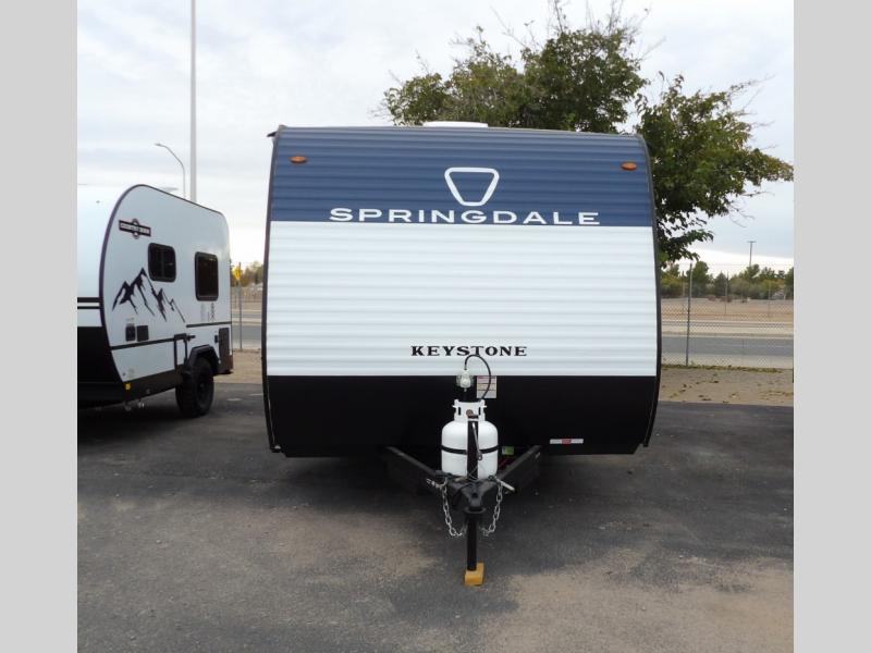 With any Springdale Mini travel trailer by Keystone, you will enjoy lightweight towing thanks to their single-axle! The AlphaPly TPO roof membrane is ultra durable, and the power awning will provide protection from the sun as you relax in your camp chairs outside. Each model includes blackout night shades, LED lighting, plus many more interior comforts. There is also a roof A/C and 20K BTU furnace to keep you comfortable, plus a tankless water heater for endless hot showers!