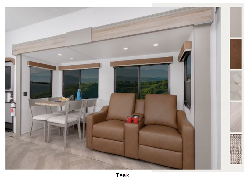 You will find residential style seamless marbled countertops, Dyna Span marine grade decking, residential style screwed and glued cabinetry, and designer upholstered window valances to make you feel right at home. The MaxTurn technology with Road Armor will make for smooth towing and the automotive-grade painted fiberglass front cap includes KeyShield protection for added convenience.