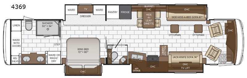 Sleeps 5 Slides 3 Length 43 ft 10 in Ext Width 8 ft 6 in Ext Height 13 ft 1 in Int Height 6 ft 11 in Interior Color Brighton, Palisades, Saguaro Exterior Color Cider, Ebony, Sky Hitch Weight 15000 lbs GVWR 45600 lbs Dry Weight 36950 lbs Cargo Capacity 8650 lbs Fresh Water Capacity 105 gals Grey Water Capacity 75 gals Black Water Capacity 55 gals Furnace BTU 50000 btu Generator 8.0 kW Cummins Onan Diesel Quiet Series Fuel Type Diesel Engine Cummins L 8.9 Chassis Freightliner XCR Tag Axle Horsepower 400 hp Fuel Capacity 100 gals Wheelbase 281 in Available Beds King Torque 1250 ft-lb Refrigerator Type Whirlpool Refrigerator Size 19.7 cu ft Convection Cooking Yes Cooktop Burners 2 Shower Size 50" x 34" Number of Awnings 1 Axle Weight Front 15600 lbs Axle Weight Rear 20000 lbs Axle Weight Tag 10000 lbs Water Heater Type Continuous AC BTU 45000 btu TV Info LR 50" Samsung LED 4K TV on Televator, BR Samsung LED 4K Awning Info Girard G2000 Power w/Wind Sensor, Remote, and LED Lights Washer/Dryer Available Yes Gross Combined Weight 60600 lbs Shower Type Shower w/Seat Electrical Service 50 amp Similar Motor Home Class A - Diesel Floorplans