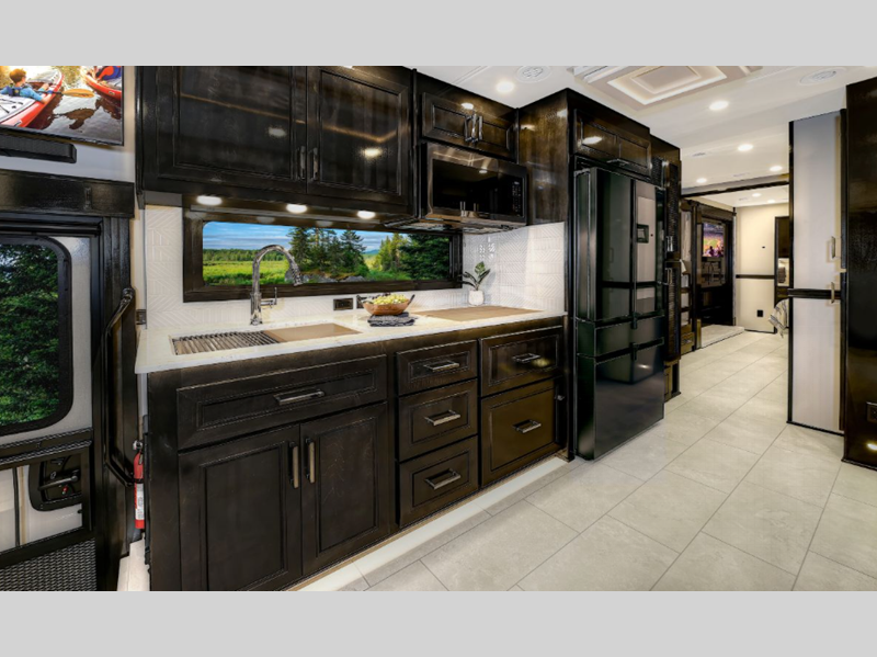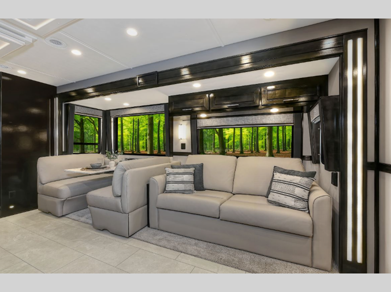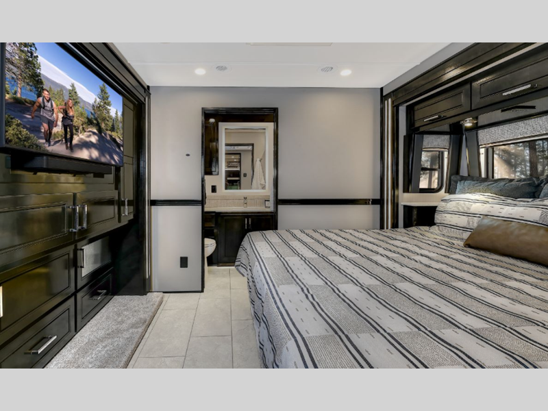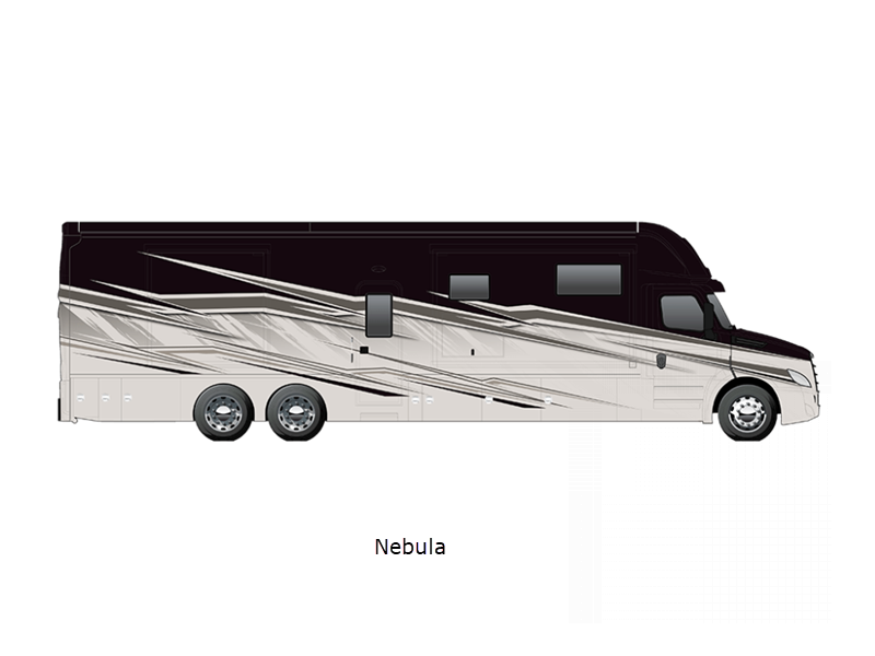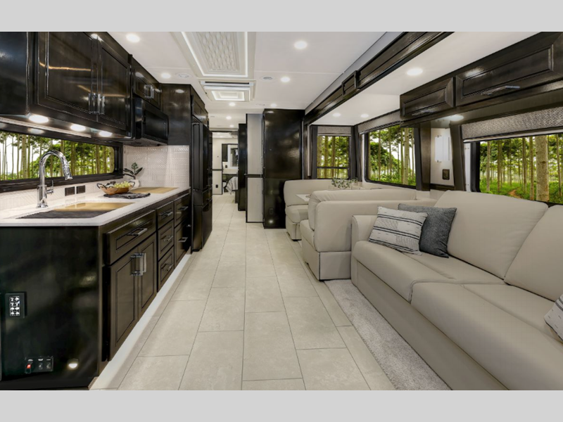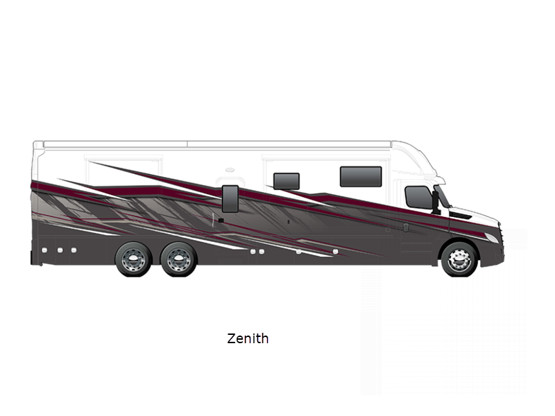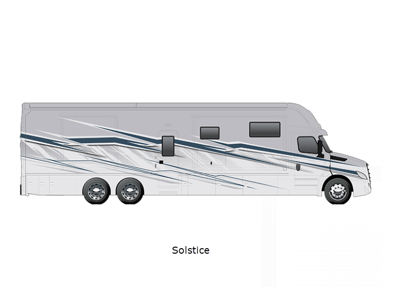 Sleeps 6 Slides 4 Length 44 ft 11 in Ext Width 8 ft 4 in Ext Height 13 ft 6 in Int Height 7 ft Interior Color Nordic, Pinnacle, Slate Exterior Color Eclipse, Meridian, Nebula, Solstice, Zenith, Polaris, Tundra, Atlas LR, Mojave Hitch Weight 30000 lbs GVWR 58000 lbs Fresh Water Capacity 150 gals Grey Water Capacity 75 gals Black Water Capacity 75 gals Generator 12.5 kW Onan Quiet Diesel Fuel Type Diesel Engine Detroit DD16 Horsepower 600 hp Fuel Capacity 120 gals Available Beds RV King Torque 1850 ft-lb Refrigerator Type Samsung Bespoke with Family Hub Refrigerator Size 23 cu ft Convection Cooking Yes Cooktop Burners 2 Shower Size 42" x 35" Number of Awnings 2 Water Heater Type Aqua Hot 600D AC BTU 45000 btu TV Info LR 50" 4K Smart LED TV, BR 43" 4K Smart LED TV, Ext. 43" Smart LED TV Awning Info Roof Mounted Girard 2 Stage Lateral Arm w/LED Lights Washer/Dryer Available Yes Shower Type Standard Electrical Service 50 amp Similar Floorplans