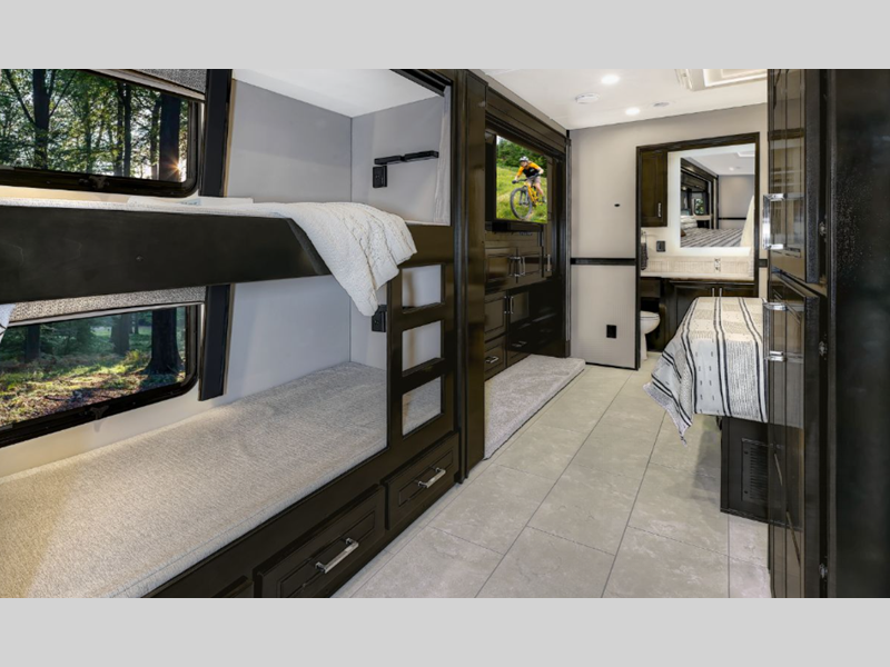 Sleeps 7 Slides 3 Length 44 ft 11 in Ext Width 8 ft 4 in Ext Height 13 ft 6 in Int Height 7 ft 6 in Interior Color Nordic, Pinnacle, Slate Exterior Color Eclipse, Meridian, Nebula, Solstice, Zenith, Polaris, Tundra, Atlas LR, Mojave Hitch Weight 30000 lbs GVWR 58000 lbs Fresh Water Capacity 150 gals Grey Water Capacity 75 gals Black Water Capacity 75 gals Generator 12.5 kW Onan Quiet Diesel Fuel Type Diesel Engine Detroit DD16 Horsepower 600 hp Fuel Capacity 120 gals Number Of Bunks 2 Available Beds RV King Torque 1850 ft-lb Refrigerator Type Samsung Bespoke with Family Hub Refrigerator Size 23 cu ft Convection Cooking Yes Cooktop Burners 2 Shower Size 42" x 35" Number of Awnings 2 Water Heater Type Aqua Hot 600D AC BTU 45000 btu TV Info LR 50" 4K Smart LED TV, BR 43" 4K Smart LED TV, Ext. 43" Smart LED TV Awning Info Roof Mounted Girard 2 Stage Lateral Arm w/LED Lights Washer/Dryer Available Yes Shower Type Standard Electrical Service 50 amp Similar Floorplans