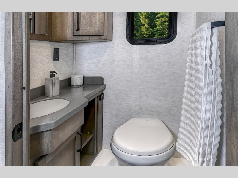 Step inside to find beautiful solid surface countertops, premium one-piece vinyl flooring throughout, solid wood cabinets, and more luxury features. You can fit all of your gear in the composite liner storage compartments relax under the lateral arm electric awning with LED lights, and use the see-level® tank monitoring system to monitor your units tank levels. You will also appreciate the 8" LCD touch screen infotainment center to make the drive that much easier, plus all of your power needs will be met with the 8kW Onan quiet diesel generator, one 400AH lithium battery, and a 3,000 True Sine wave inverter!