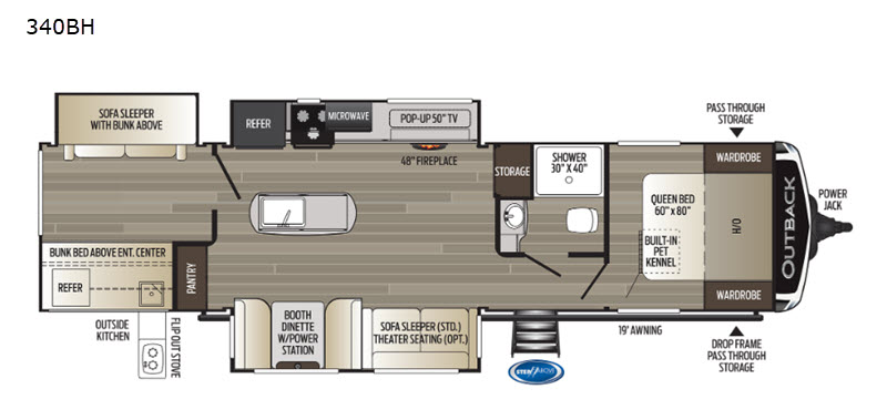 The Keystone Outback is a trailer that has truly been designed for a lifetime of RVing. With its tinted safety glass windows, heated and enclosed underbelly, block foam insulation, and various smoke detectors, you can continuously travel with a clear peace of mind. Because the Outback comes with a 30,000 BTU furnace and a 15,000 BTU air conditioner, you will always remain comfortable through any climate as you sleep inside each night, and the 50 AMP power source will ensure that you are able to use each of your favorite electric features.