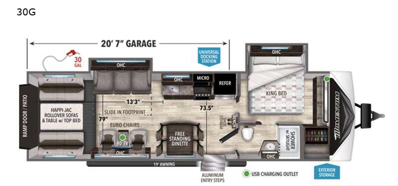 The whole family will love camping in this Momentum G-Class toy hauler! It features a front master suite with a king bed, USB charging outlet, and an entrance into the dual-entry bathroom which has a walk-in shower with a skylight. Just outside the bathroom is a bench with shoe storage for you to easily put your shoes on before leaving the unit. The kitchen has everything you will need to create your best home-cooked meals including a three-burner range with oven. You can enjoy your meals at the free-standing dinette and then play a card game or relax on the theater seating with USB charging outlets. The Euro chairs would be a comfortable place to relax too. In the rear, there are Happi-Jac rollover sofas with a table and a top bed above for added sleeping space!