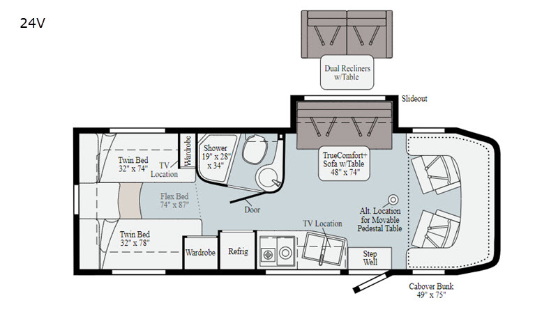 - Flex Bed System twin beds/king bed w/foam mattresses and access to storage below (24V)