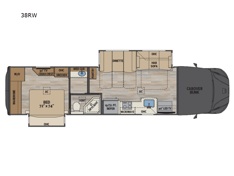 Enjoy a home on wheels with this motorhome! Start your mornings feeling refreshed and ready to go after sleeping on the 72" x 74" king bed and showering in the neo-angled shower with a skylight above and a vent to eliminate steam in the separated bathroom. The bedroom also has a 32" TV with a cedar chest, a dresser with overhead cabinets, a large wardrobe, and an area prepped to add an optional washer and dryer. You can prepare your best meals with the three burner cooktop and 18 cu. ft. refrigerator and enjoy them at the booth dinette. The hide-a-bed sofa and 54" x 80" bunk over cab offer comfortable sleeping spaces for extra guests too!